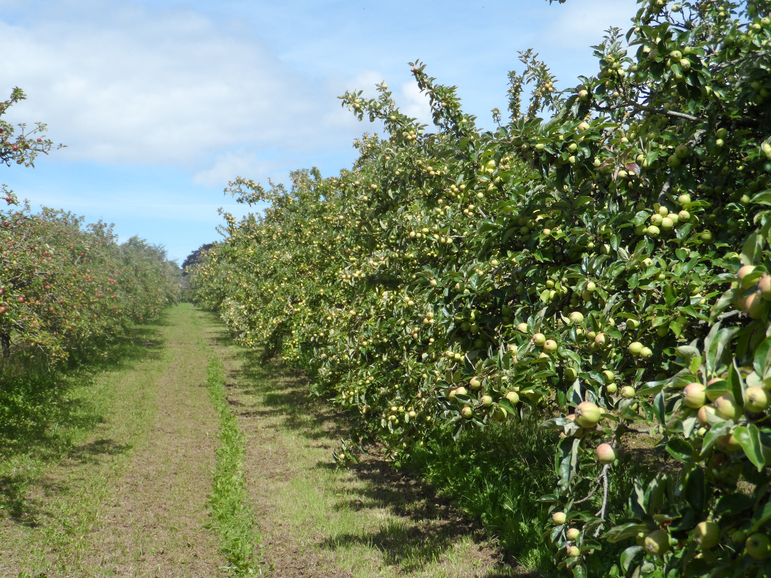 We grow 12 varieties of cider apples in our orchard. Some are known as bitter sharp, and others are bittersweet. Each cider apple has been chosen for its own taste profile and its suitability as a pollinator for some of the other varieties. We don't use pesticides in our orchard; instead, we let nature do the work for us. For example, we work hard to maintain the biodiversity of the orchard by leaving some standing deadwood to encourage insects. We put up bird boxes and feeders to increase our bird population, which, in turn, helps to reduce pests. We have beehives and solitary bee habitats to aid in pollination of the fruit, and we aerate the soil to keep the worms happy. All of this leads to growing the most delicious apples possible.